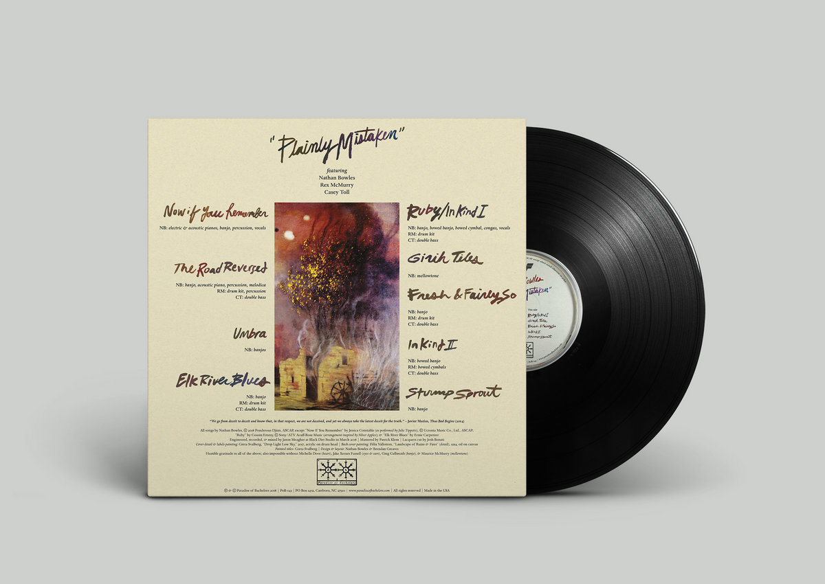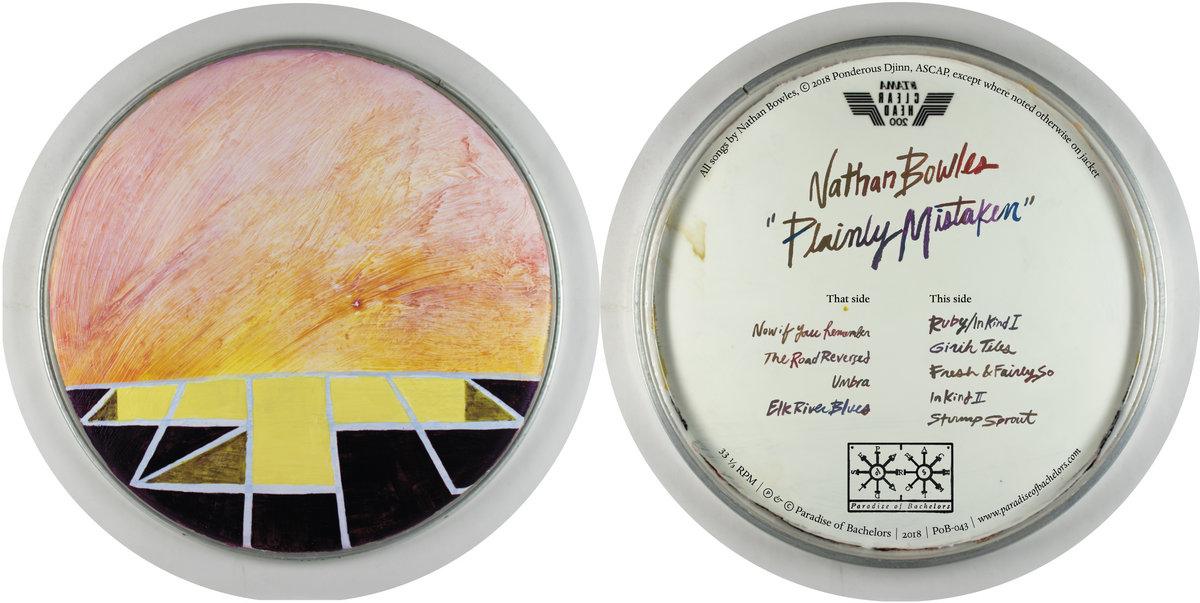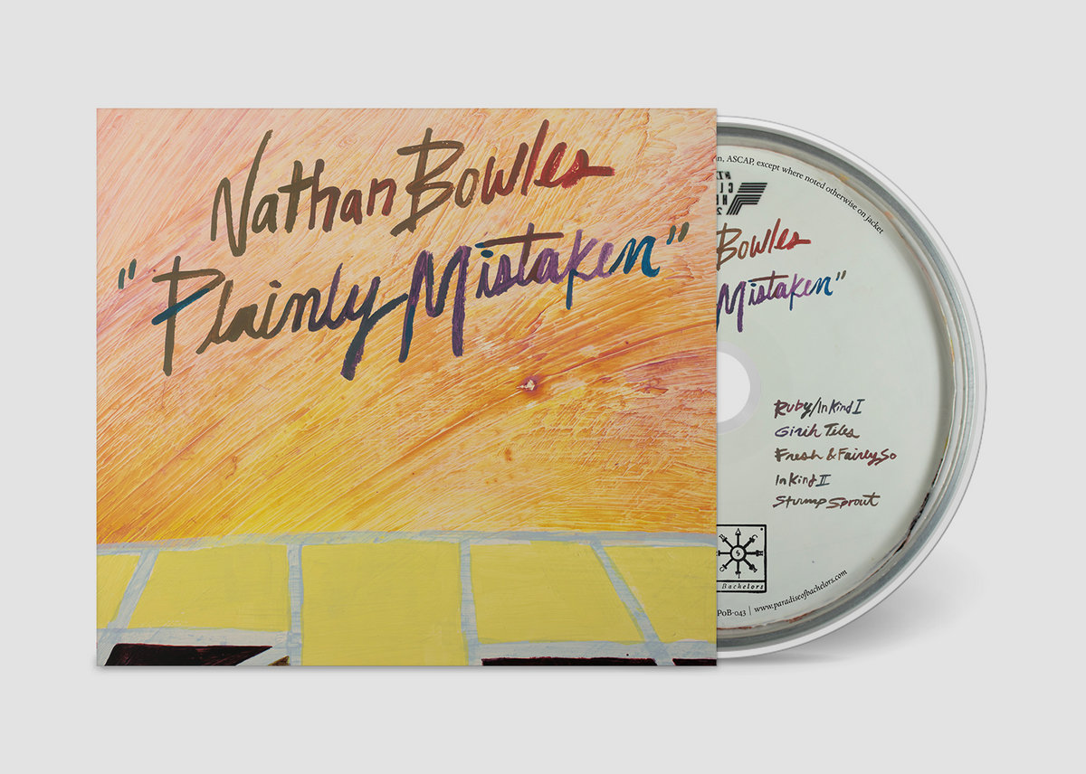 Plainly Mistaken, the playfully subversive fourth solo album by Durham, North Carolina multi-instrumentalist Nathan Bowles, begins with a lullaby written by a child for an adult. The seven year-old Jessica Constable composed “Now If You Remember”—the titular lyric continues, precociously, “we were talking about God and you”—for English singer Julie Tippetts’s 1976 album Sunset Glow. Bowles’s ethereal rendering represents a rather radical departure from his previous recordings; his placidly plaintive singing has been stripped of its otherwise genial, ursine gruffness, and the brief song floats by on the sedative ebb tide of banjo and pianos both acoustic and electric.